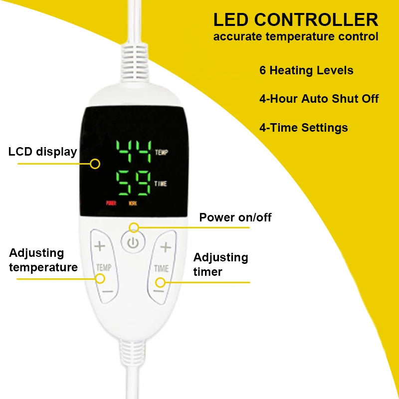【EASY TO USE】: LED Controller (38/42/45/48/52/55°C) 6 heat settings and (2/4/6/10h) 4 gears timer auto-off function, enjoy a rapidly heated blanket with an ergonomic, very convenient to use, even the elderly,the sick,and the disabled can use it easily. can be used on the bed,on the sofa,can be used in the study and office, very convenient.